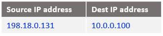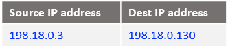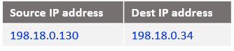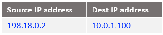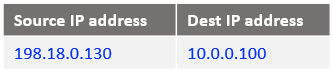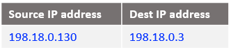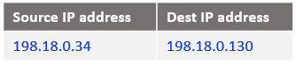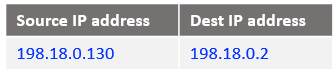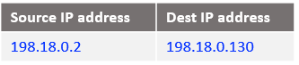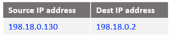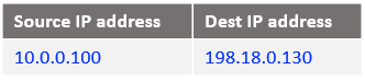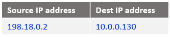 Following the logic, if the source IP address is 10.0.0.130 and the destination 198.18.0.2 change the destination IP address to 198.18.0.130 and route the IP packet. After all NAT processing on NAT VM1 the IP packet sent to NAT VM2 is: