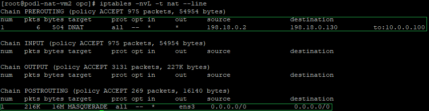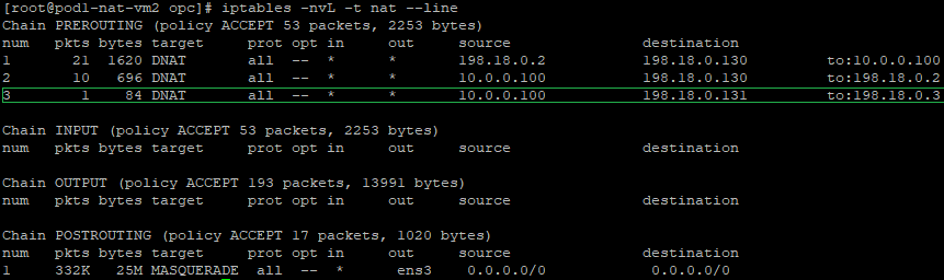 The above command is having the following logic: if the source IP address of the incoming packet is 198.18.0.130 and the destination IP address is 198.18.0.3 change the destination IP from 198.18.0.3 to 10.0.1.100 which is the Customer 2 VM2. All traffic reaching NAT VM1 from NAT VM2 will have as a source IP address of 198.18.0.130 from the NAT Masquerade on the NAT VM2.