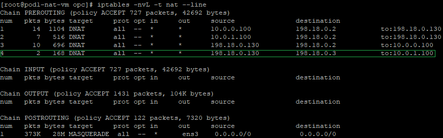a) create a DNAT (Destination NAT) entry in the iptables PREROUTING NAT chain – the DNAT entry is necessary because we need to change the destination IP address from 198.18.0.131 to 198.18.0.3 (a secondary IP address on the NAT VM1 vnic) where the final forwarding toward the VM1 will be done, the command is: