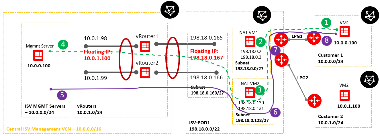 The purple solid line represents the traffic path for the response sent by the ISV Mgmt Server to Customer 1 VM2.