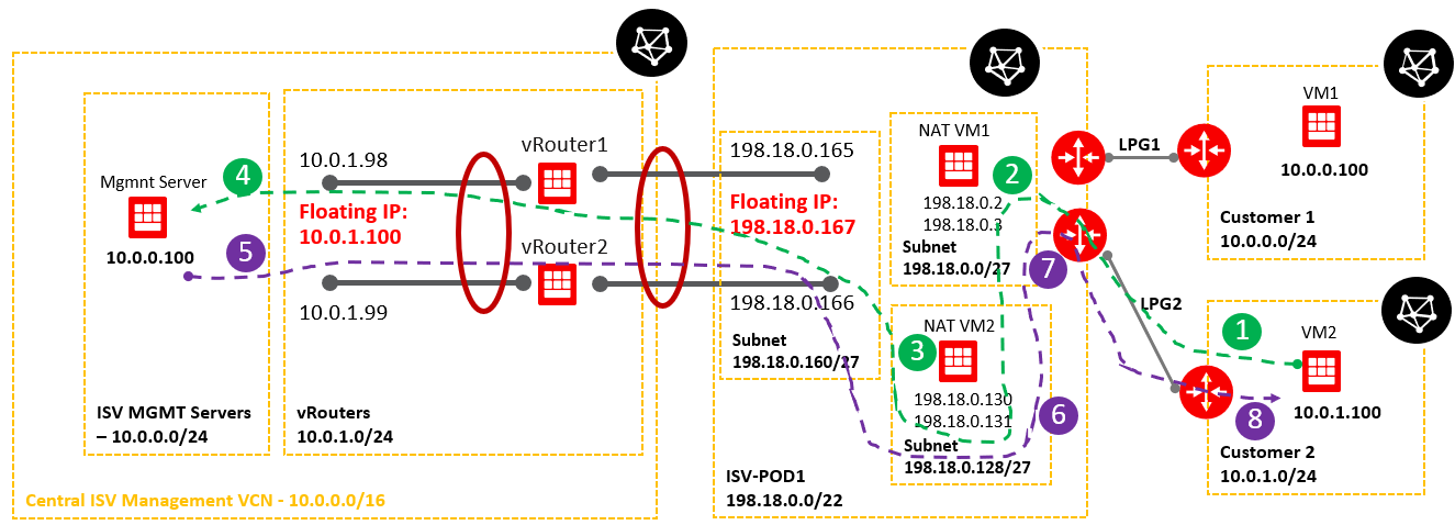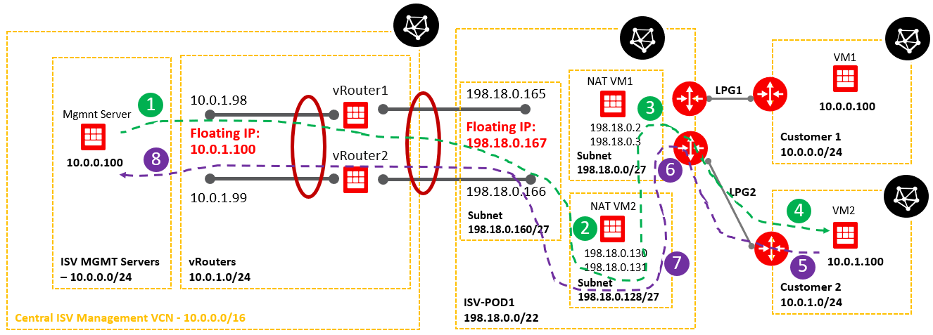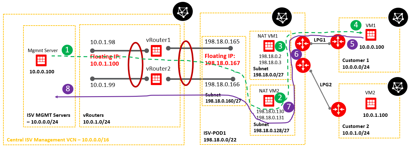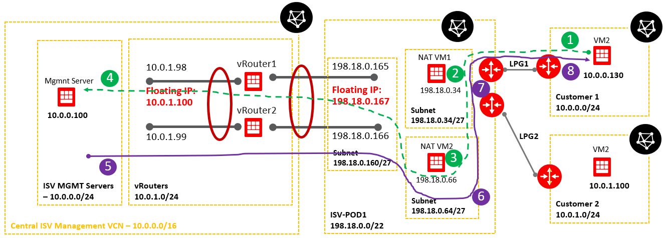 An ISV has multiple management servers sitting in a “shared subnet”. Mgmt Server 1 – with IP 10.0.0.101, Mgmt Server 2 – 10.0.0.102, Mgmt Server 3 – 10.0.0.103 and so on. On the other hand, the customers VCNs in some scenarios can contain VMs with 10.0.0.101, 10.0.0.102, 10.0.0.103 etc. as IP address. Our goal is to make the IP connectivity between Mgmt servers from the “shared subnet” to talk with the customer VMs with the same IP addresses as the Mgmt servers.