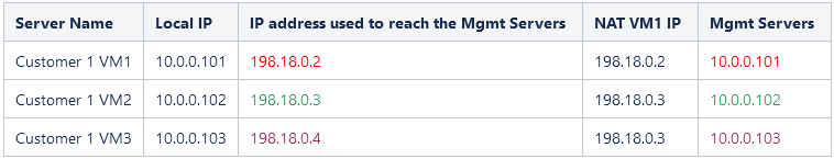 In order to have a working solution, we need to instruct either the Mgmt Servers that the Customers have a different unique IP address and vice-versa. The following table is summarizing an example of a unique IP address plan used in the NAT policies. Please follow the step-by-step examples listed in section 4 for any details regarding the NAT configuration.
