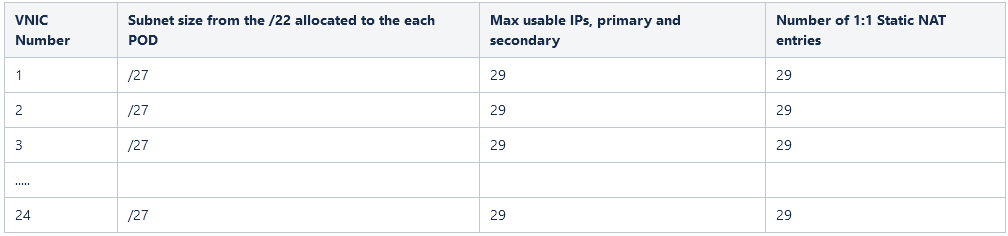 - From the /22 we will define /27 subnets for up to 32 subnets (8×4) to accommodate all the 24 interfaces that can be added to a 2.24 VM shape and a /29 subnet to accommodate the virtual router in the POD;