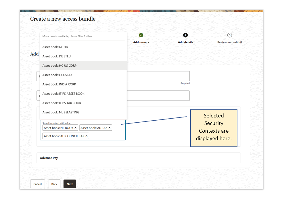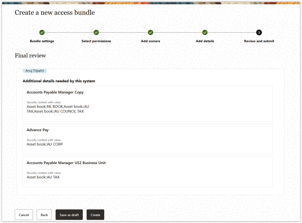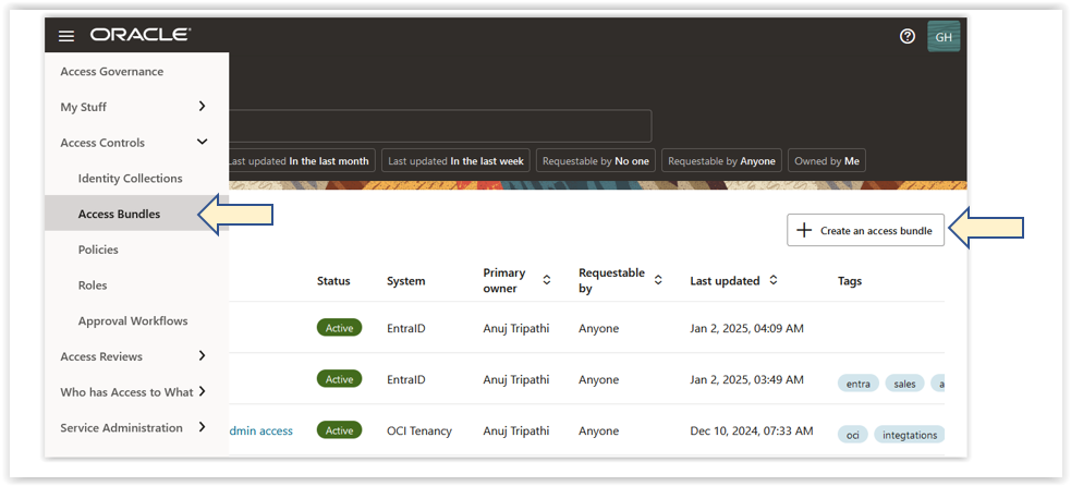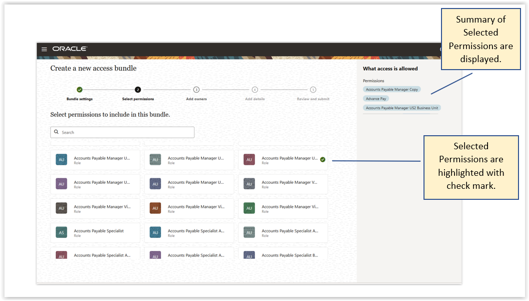 Oracle Access Governance users can request access to Fusion and Fusion ERP resources through defined roles and Access Bundles. Access Bundles are constructs within Access Governance that consolidate permissions, packaging access to resources, application features, and functionality into a requestable unit. These bundles can be dynamically auto-assigned via policy or through manual requests.