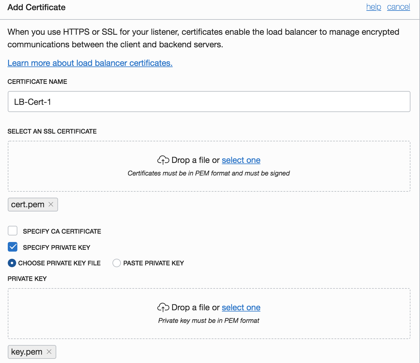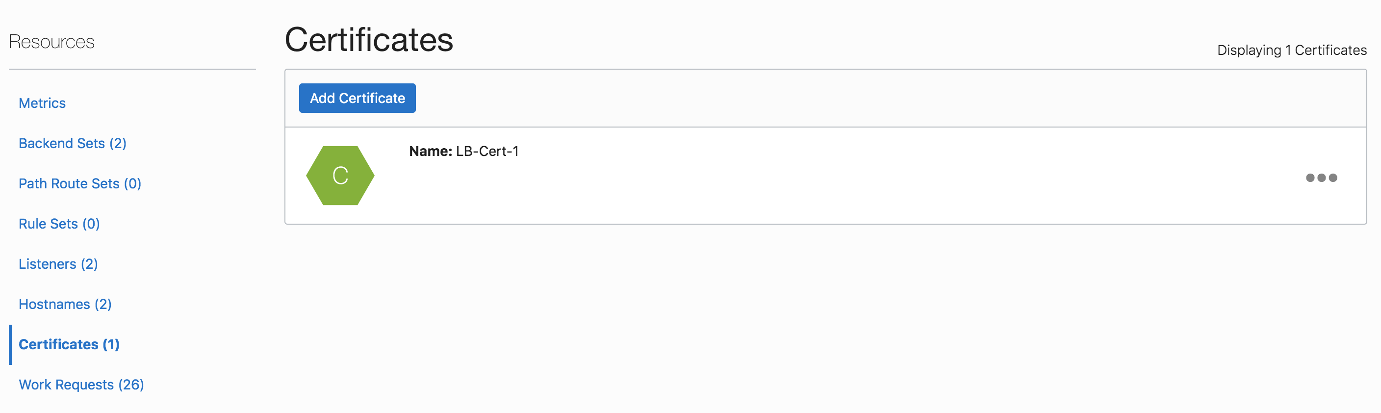 Since the SSL is getting terminated at the Load Balancer, the Load Balancer should have its own pair of <private key, public certificate>. This will ensure that client communication with the Load Balancer is secured. For this illustration, I have used openssl to generate <key, cert> pair. The certificate is a self-signed certificate in the pem format with the Common Name as “LB-SSL”. The pair <key.pem, cert.pem> > is uploaded onto the OCI and associated with the Load Balancer. The entry is named LB-Cert-1 as shown in the figure below.