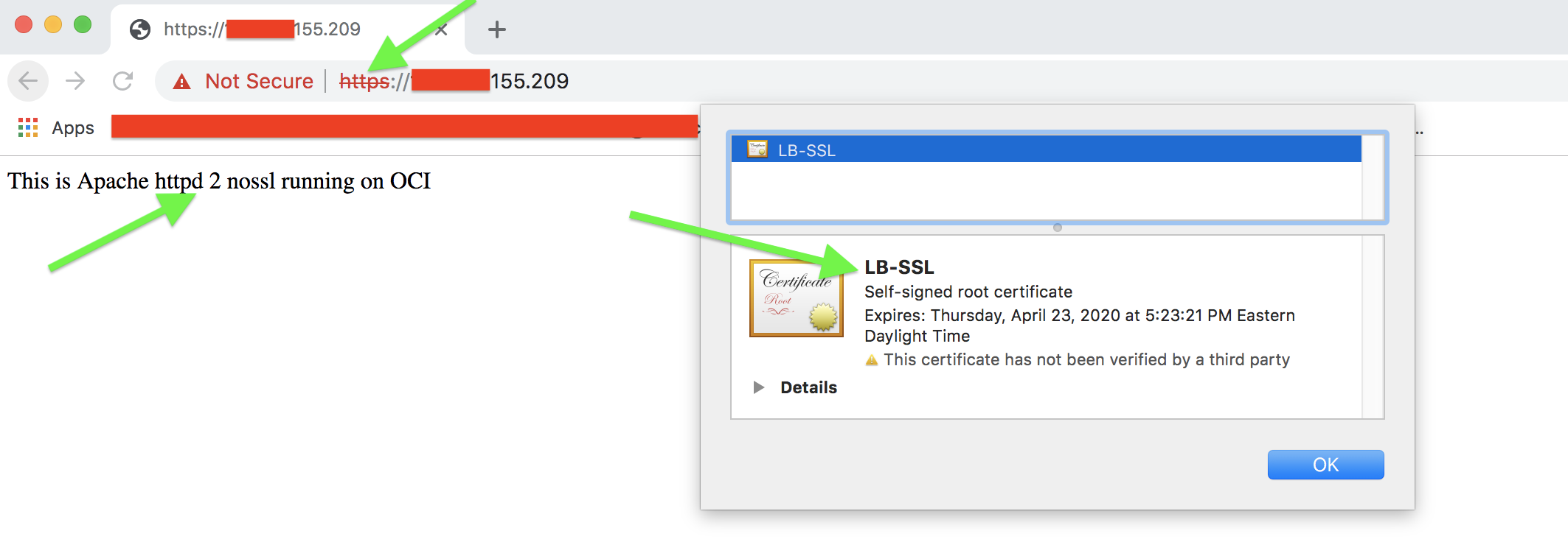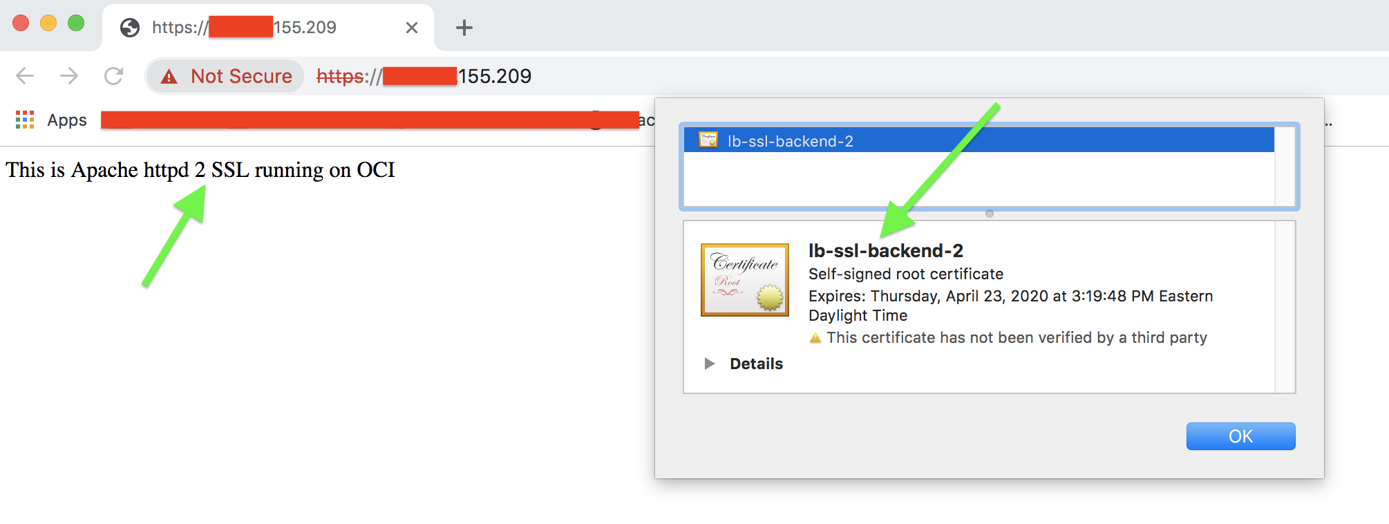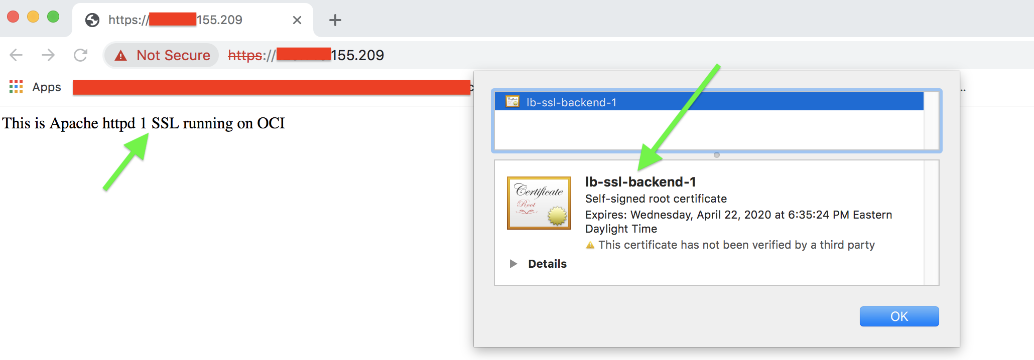 In the above figure, the TCP connection is tunneled through the Load Balancer all the way to a Backend.  Thus the SSL connections get terminated at the Backend servers. To illustrate this scenario, I will use a Backend Set comprising of two new Oracle Linux compute instances – lb-ssl-backend-1, lb-ssl-backend-2. Unlike the SSL Termination scenario where the two servers had just Apache HTTP Server installed,  here I have installed Apache with mod_ssl package on both the instances. The installation generates a self-signed certificate with the hostname as the Common Name of the certificate. On each compute instance, I have opened just the https service using the firewall-cmd, resulting in the Apache servers accepting only SSL connections over port 443. I have added the statement – “This is Apache httpd #n SSL running on OCI” – to each Apache’s /var/www/html/index.html file where #n is 1 or 2 for lb-ssl-backend-1 and lb-ssl-backend-2 respectively.