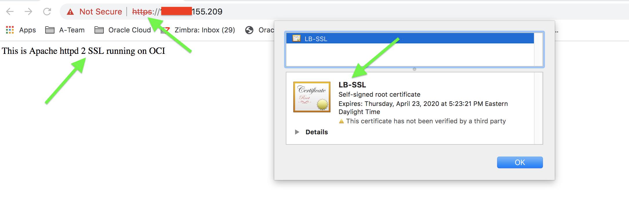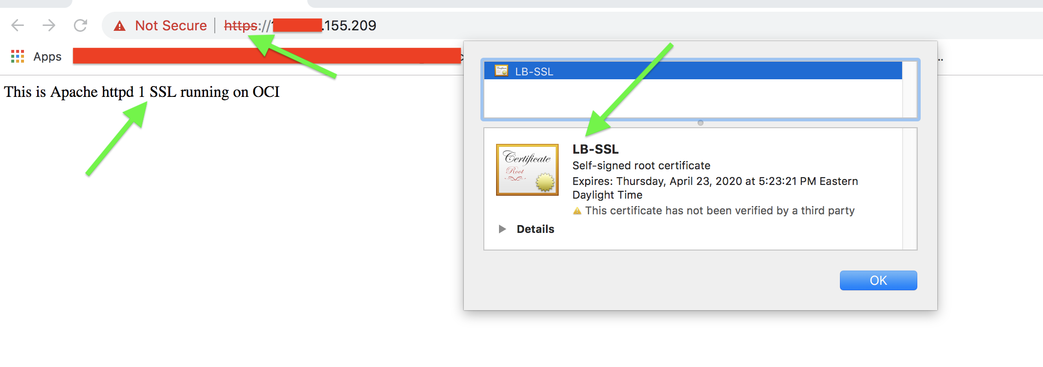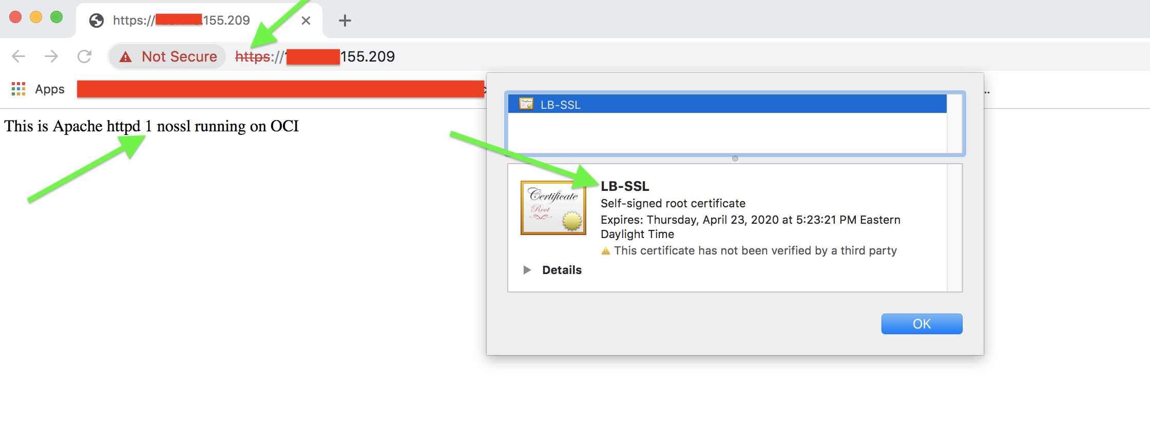 In the above figure, the TCP connection is tunneled through the Load Balancer all the way to a Backend.  Thus the SSL connections get terminated at the Backend servers. To illustrate this scenario, I will use a Backend Set comprising of two new Oracle Linux compute instances – lb-ssl-backend-1, lb-ssl-backend-2. Unlike the SSL Termination scenario where the two servers had just Apache HTTP Server installed,  here I have installed Apache with mod_ssl package on both the instances. The installation generates a self-signed certificate with the hostname as the Common Name of the certificate. On each compute instance, I have opened just the https service using the firewall-cmd, resulting in the Apache servers accepting only SSL connections over port 443. I have added the statement – “This is Apache httpd #n SSL running on OCI” – to each Apache’s /var/www/html/index.html file where #n is 1 or 2 for lb-ssl-backend-1 and lb-ssl-backend-2 respectively.