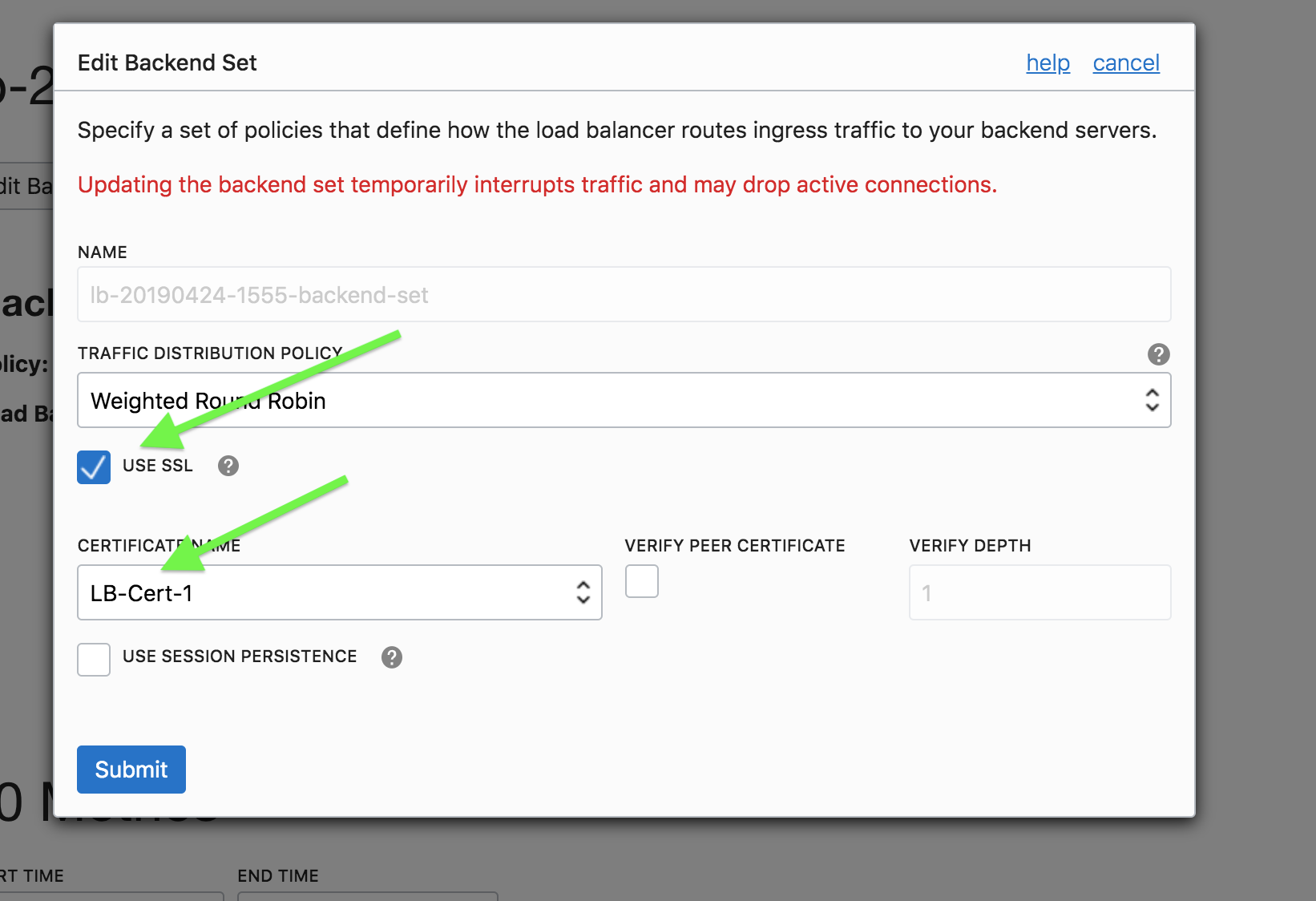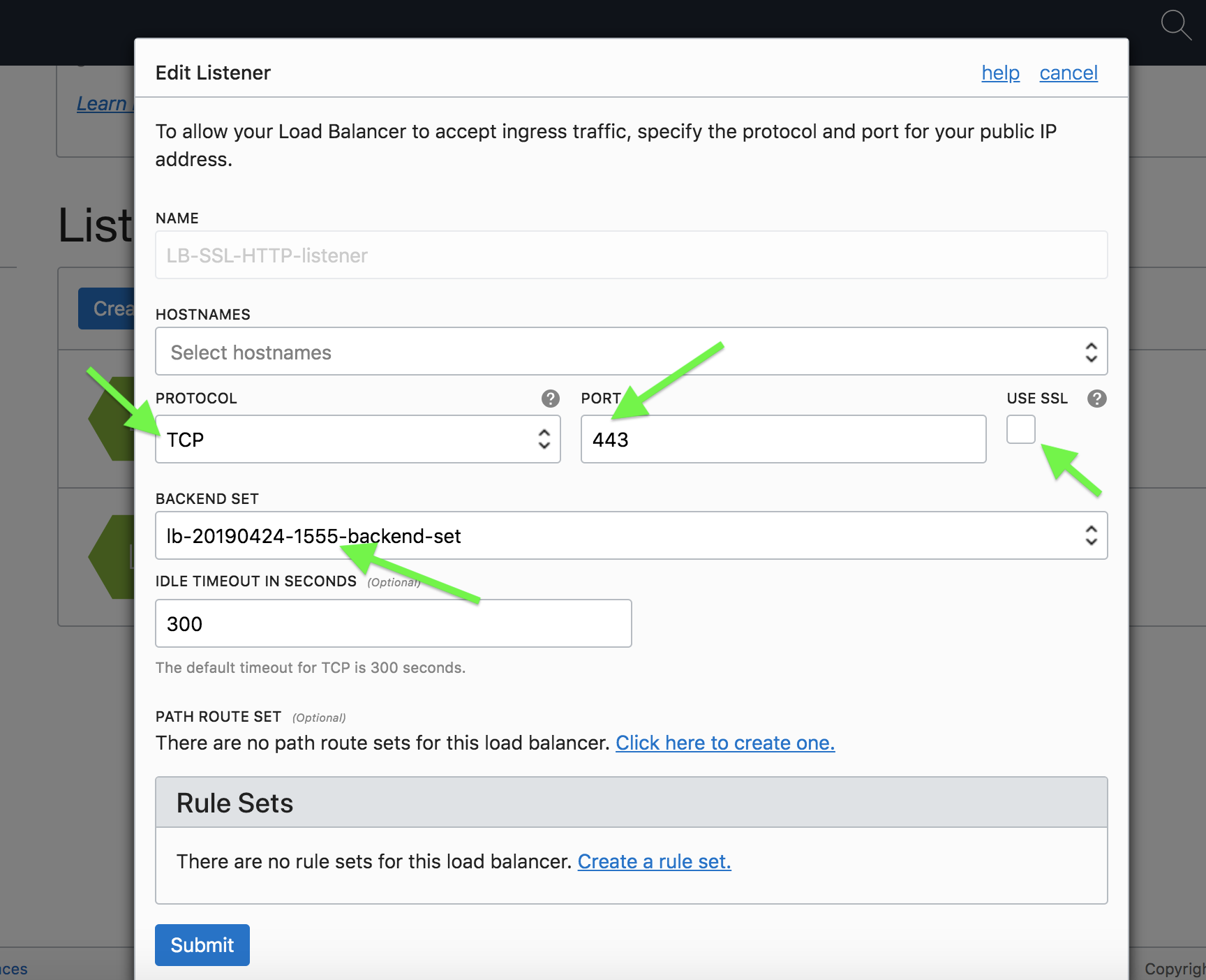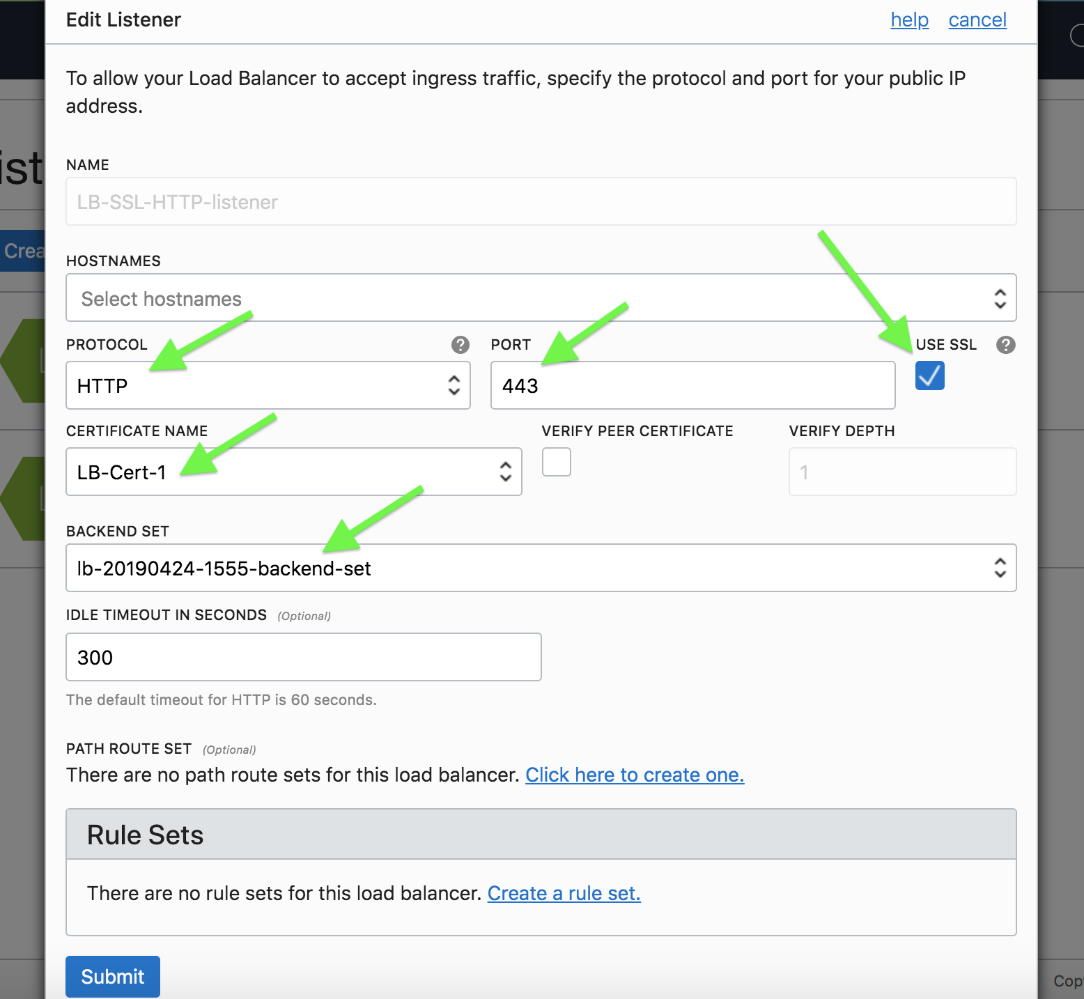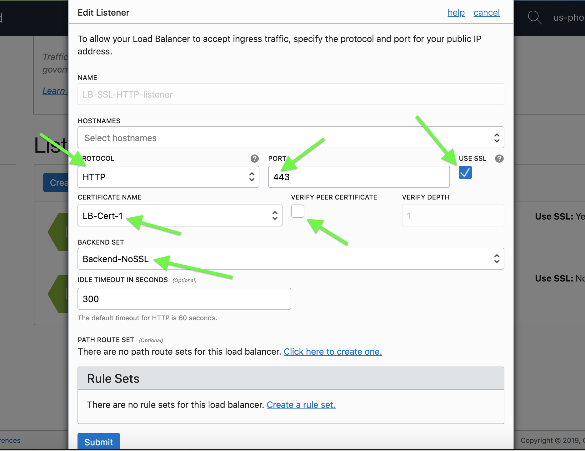 With the Backend Set ready, let’s define the Listener. The Listener is very similar to SSL Termination use case with the exception of the Backend Set. This time the Load Balancer initiates SSL connections with the two Backends lb-ssl-backend-1 and lb-ssl-backend-2.