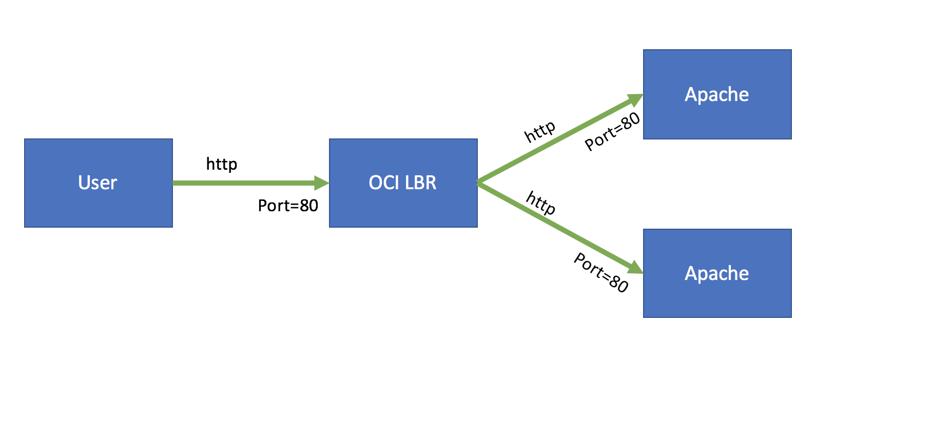 I have two compute instances in OCI running Apache HTTP Server. The Apaches are listening on port 80 for incoming requests. I have defined a Load Balancer in OCI which routes traffic to these two Backend servers. The Load Balancer accepts http requests over port 80 as shown in the figure above. From the browser, the first time I send a http request I get the following response: