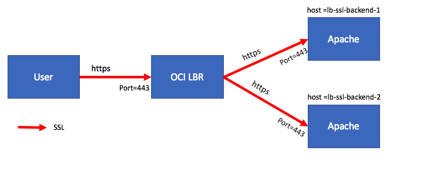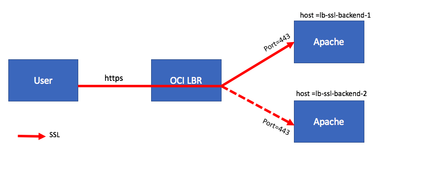 In the above figure, the SSL connection from the user is getting terminated at the Load Balancer which then initiates new SSL connections to the Backend servers. To illustrate this use case, I will reuse the Backend Set of the SSL Tunneling where both the Backends – lb-ssl-backend-1 and lb-ssl-backend-2 – accept just HTTPS requests.