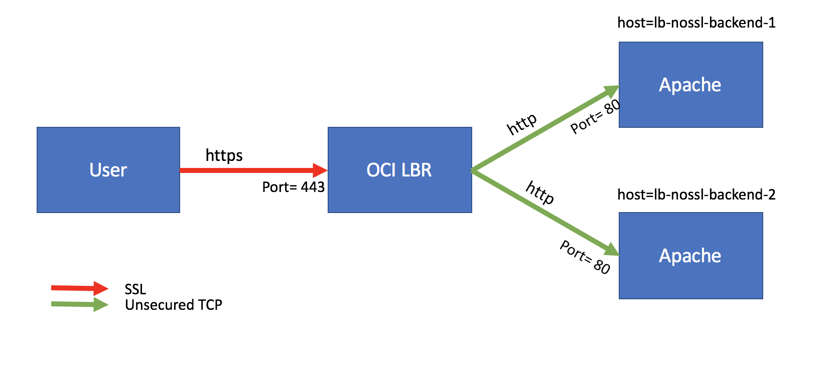 In the above figure, SSL is getting terminated at the Load Balancer which in turn establishes new unsecured TCP connections to the two Backend servers. To illustrate this scenario, I will use a Backend Set comprising of two Oracle Linux compute instances: lb-nossl-backend-1 and lb-nossl-backend-2. I have installed Apache HTTP Server on both the instances. On each compute instance, I have opened just the http service using the firewall-cmd, resulting in the Apache servers accepting only HTTP connections over port 80. I have added the statement – “This is Apache httpd #n nossl running on OCI” – to each Apache’s /var/www/html/index.html file where #n is 1 or 2 for the two Backends.