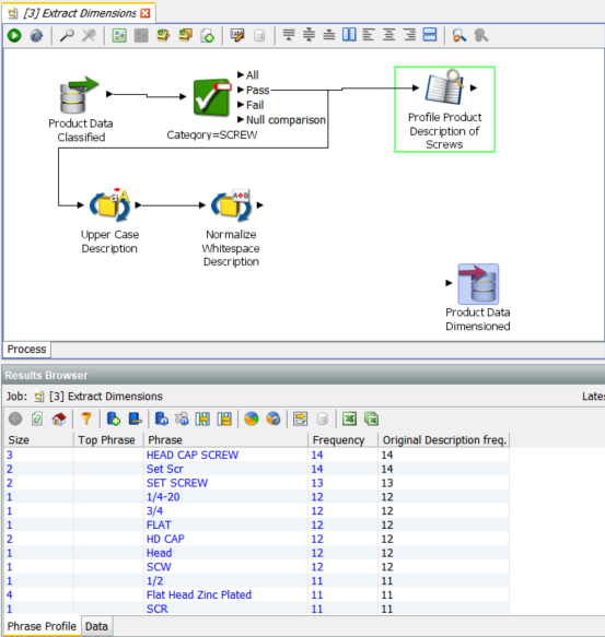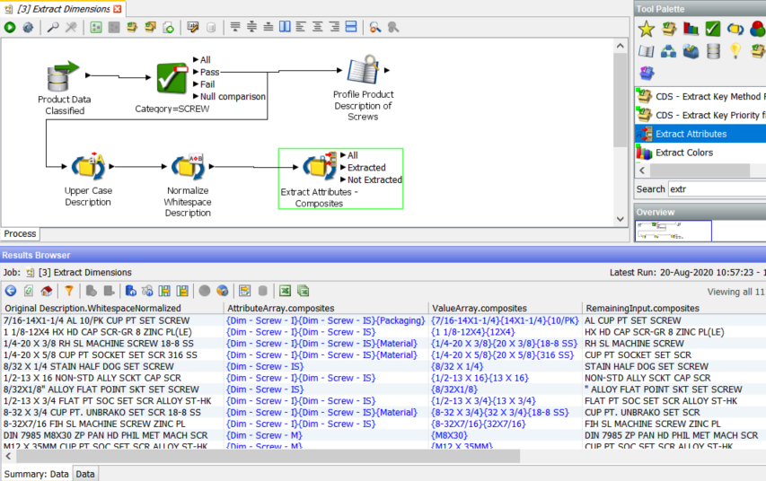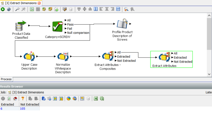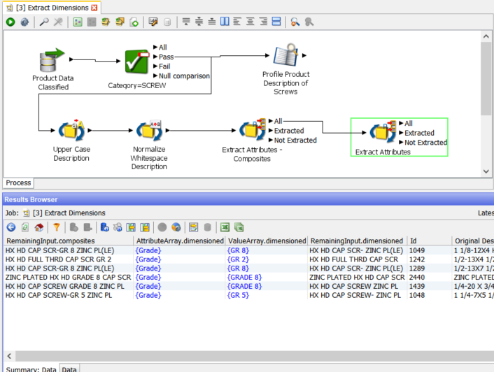 The Extract Attribute processor looks for specific patterns in the description fields which are data for specific attributes of the category we are examining, in this case ‘SCREWS’.