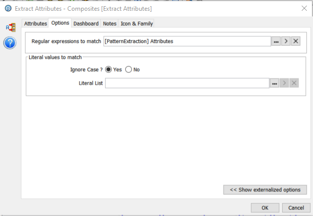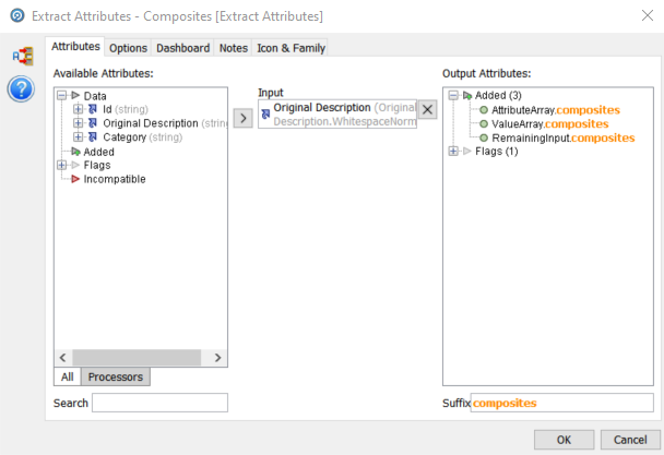 First we configure the input column, in this case ‘Original Description’. The output attributes by default are always ‘AttributeArray, ValueArray and RemainingInput. We have added the suffix ‘composites’ to indicate that it can include a number of attributes as we will see.