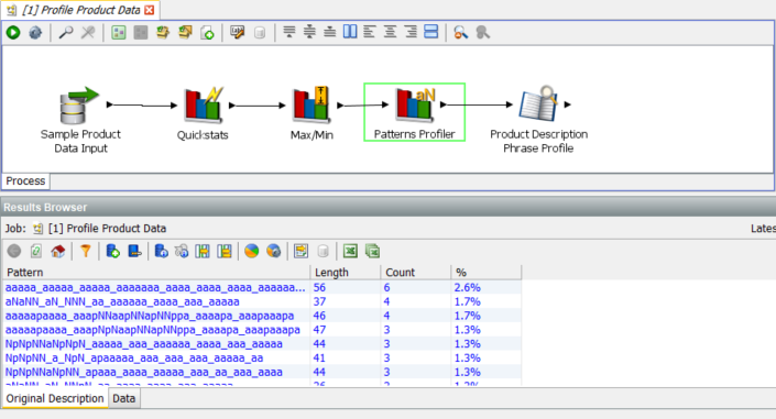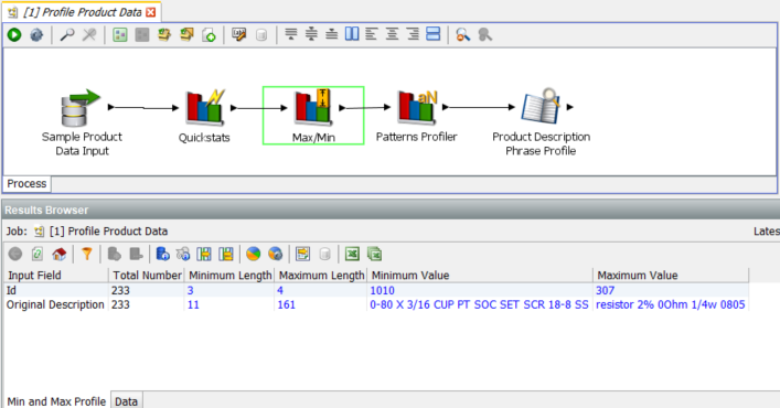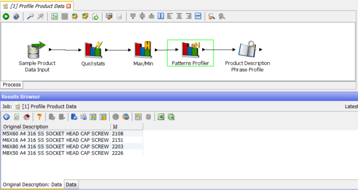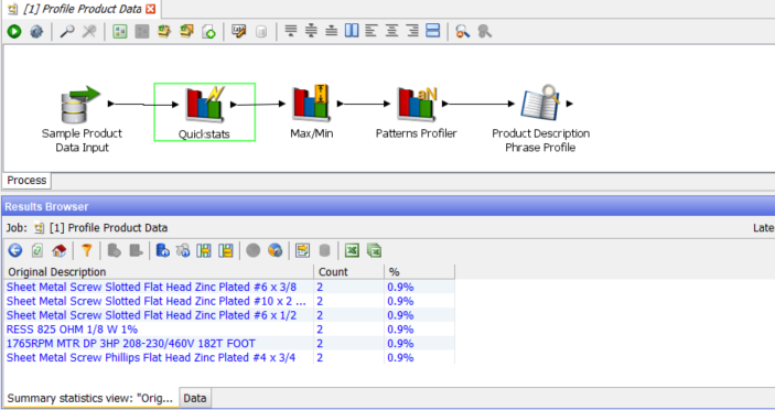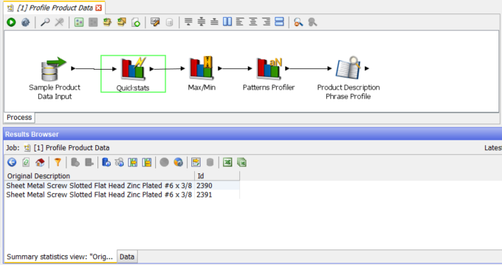 The Quickstats profiler is a quick, general purpose profiler which displays 5 metrics on each of the select columns, in this case there are only 2 columns, ‘Id’ and ‘Original Description’