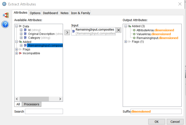 We configure the second ‘Extract Attribute’ processor to use the ‘RemainingInput.composites’ columns, as described above, with a suffix of ‘dimensioned’ as we are going to extract units of measure this time:
