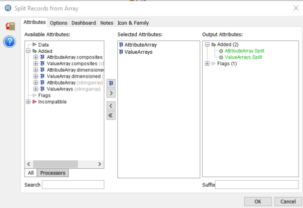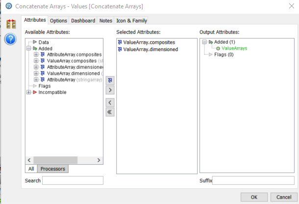 The screen shot shows the configuration for the Values array. We take the two arrays as the Selected Attributes and name the output “ValueArrays” with no suffix.