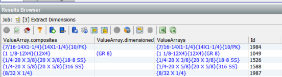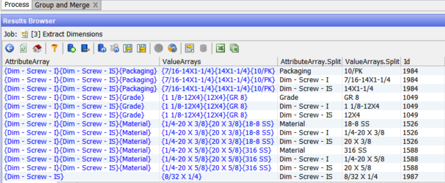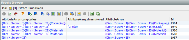 Looking at the first row we see that ‘AttributeArray.composites’ contains an array of three values, {Dim – Screw – I}{Dim – Screw – IS}{Packaging}, which are the names of the three found attributes, two dimensions and one packaging.