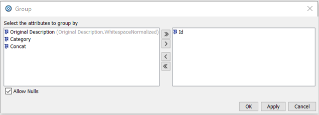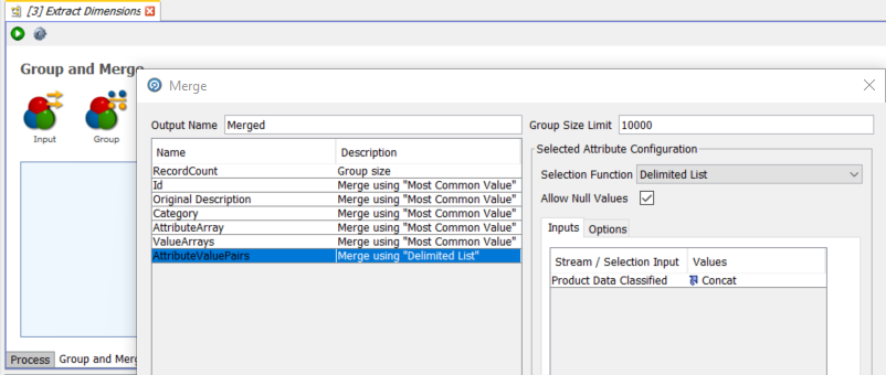 The ‘Group and Merge’ processor performs this function. It will group all records on the Id column, and merge all fields apart from ‘Concat’ (the name-value pairs value) on the basis of most common value as all the values will be the same. The ‘Concat’ field will use the ‘Delimited List’ selection function to create a single string of all of the ‘Concat’ name-value pairs for the same ‘Id’, delimited by a character of our choice.