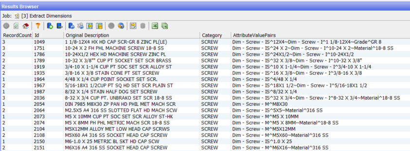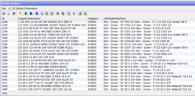 The target system at the client requires structured data records. Therefore the attribute data such as size, material, head type etc must be extracted, duplicates detected and managed, and individual records for each item produced.