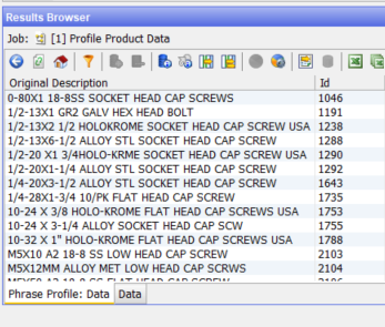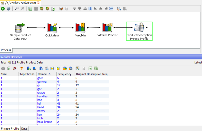 The Phrase Profiler is one of the more configurable profilers. It tokenises the input string, by default on strings but it can use any delimiters, into the constituent tokens which it the profiles on frequency. The example here is a simple single token configuration but it is also often useful to combine tokens into phrases, for example to detect ‘cross head’ for screws whenever is occurs.