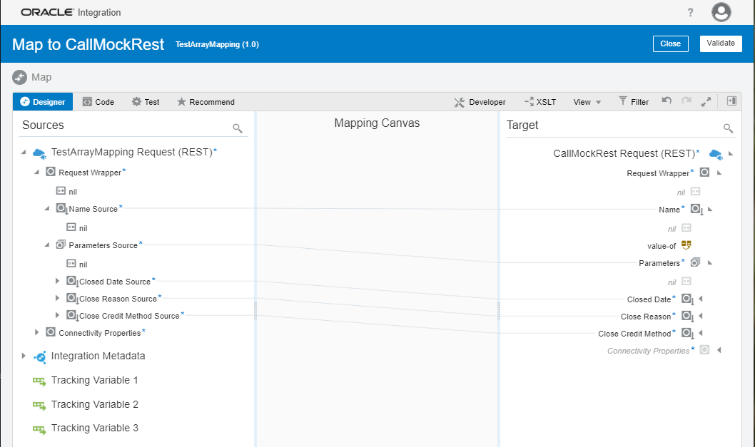 Oracle Integration Cloud provides a graphic design tool to help users construct XSLmapping. The image below shows a typical graphic mapping construct.