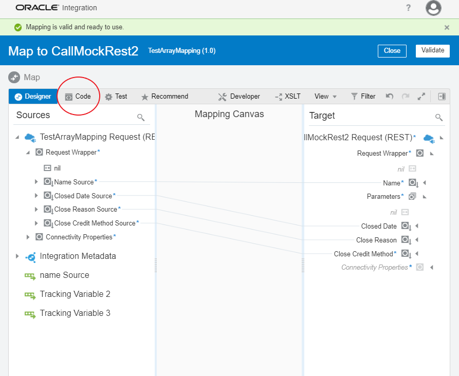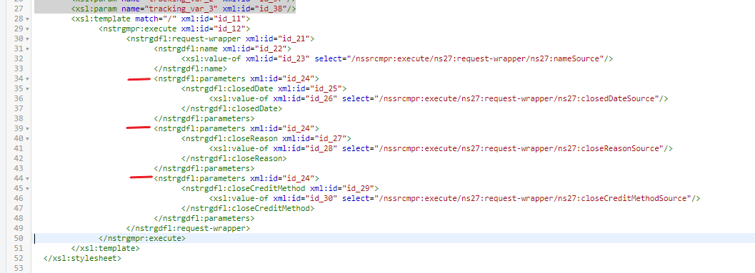 This is not a normal JSON object because each element in the array “parameters” has a different schema. Relying on the mapping design tool solely will produce an unexpected JSON object. A solution to this problem is that we manually modify the transformation in XSL code to achieve the desired outcome. Let’s use the close subscription REST call as an example to demonstrate how we can make the mapping work with some additional manual steps.