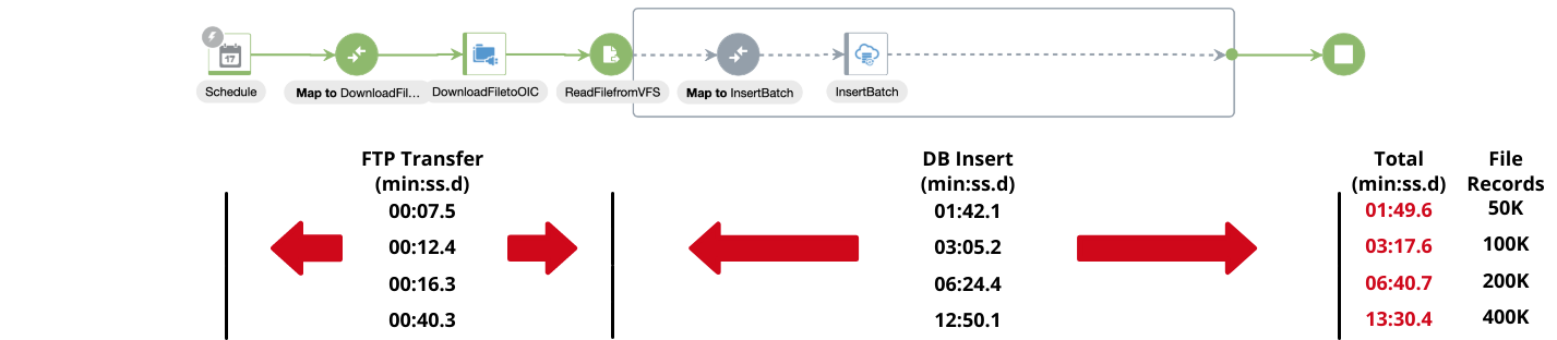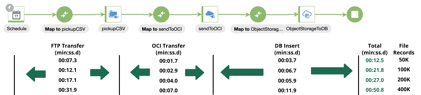 | Record Count in CSV File (Type of Flow) | Time for FTP Transfer (min:ss.d) | Time for transfer to OCI Object Storage (min:ss.d) | Time for DB insert (min:ss.d) | Total Time for Completion (min:ss.d) |