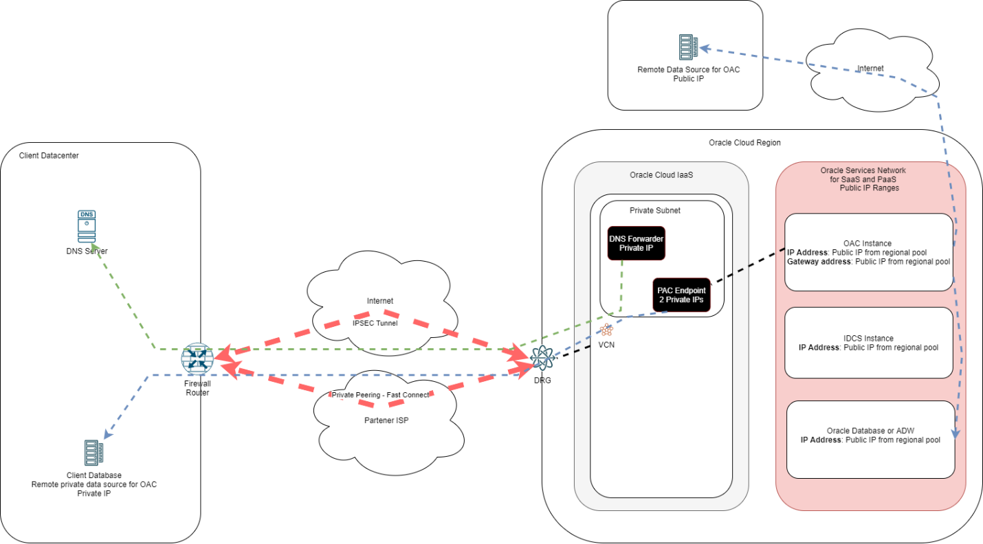 - Again, this scenario is focused on client connectivity to the OAC service. Connections from OAC to remote data sources will be over Public Internet as the OAC instance still has a Public Gateway Address.