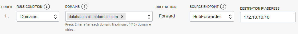 - Next click Rules on the left and click Manage Rules. Select “Domains”, input the domain defined in the PAC set up, select the source (the endpoint created earlier), and input the IP of the DNS server in your data center that can resolve that domain: