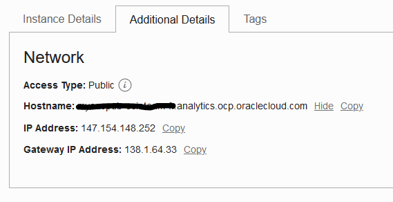 After the deployment is complete users can connect to the OAC instance via the Public IP. The gateway IP will be used by the OAC instance as the source IP to connect to remote data sources.