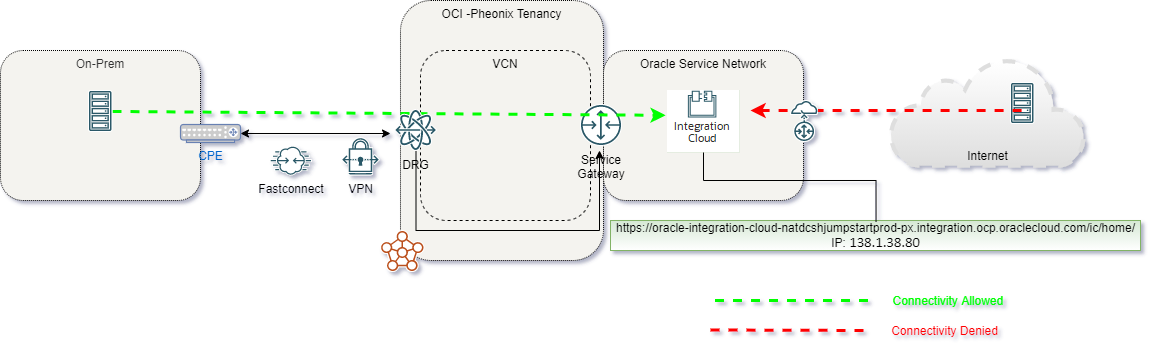 6.    At this point, all necessary routing changes will be done on the On-Premises CPE so the OIC subnet “138.1.32.0/21” (or the IP address “138.1.38.80”) will point to OCI via the VPN tunnel. After this step is completed on the On-Premises network, you should have access to the OIC instance over VPN.