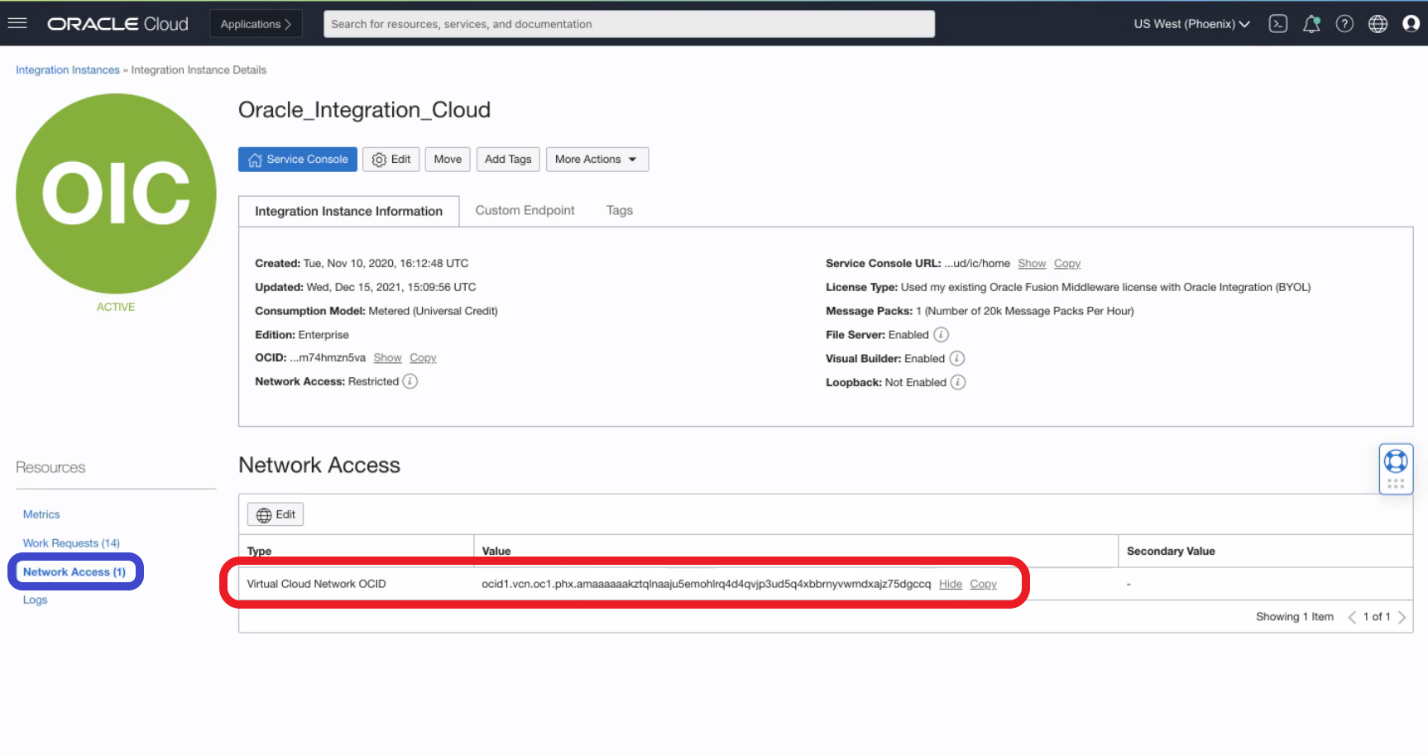 7.    The last step is to activate the OIC Network Access using the Virtual Cloud Network OCID: