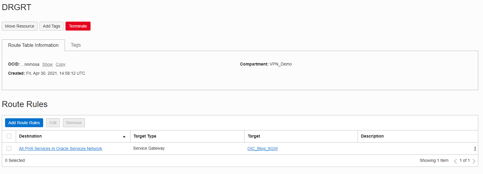 5.    With this newly created routing table, go to the Service Gateway (SGW) and attach the routing table. After this is done the SGW page should look like this:
