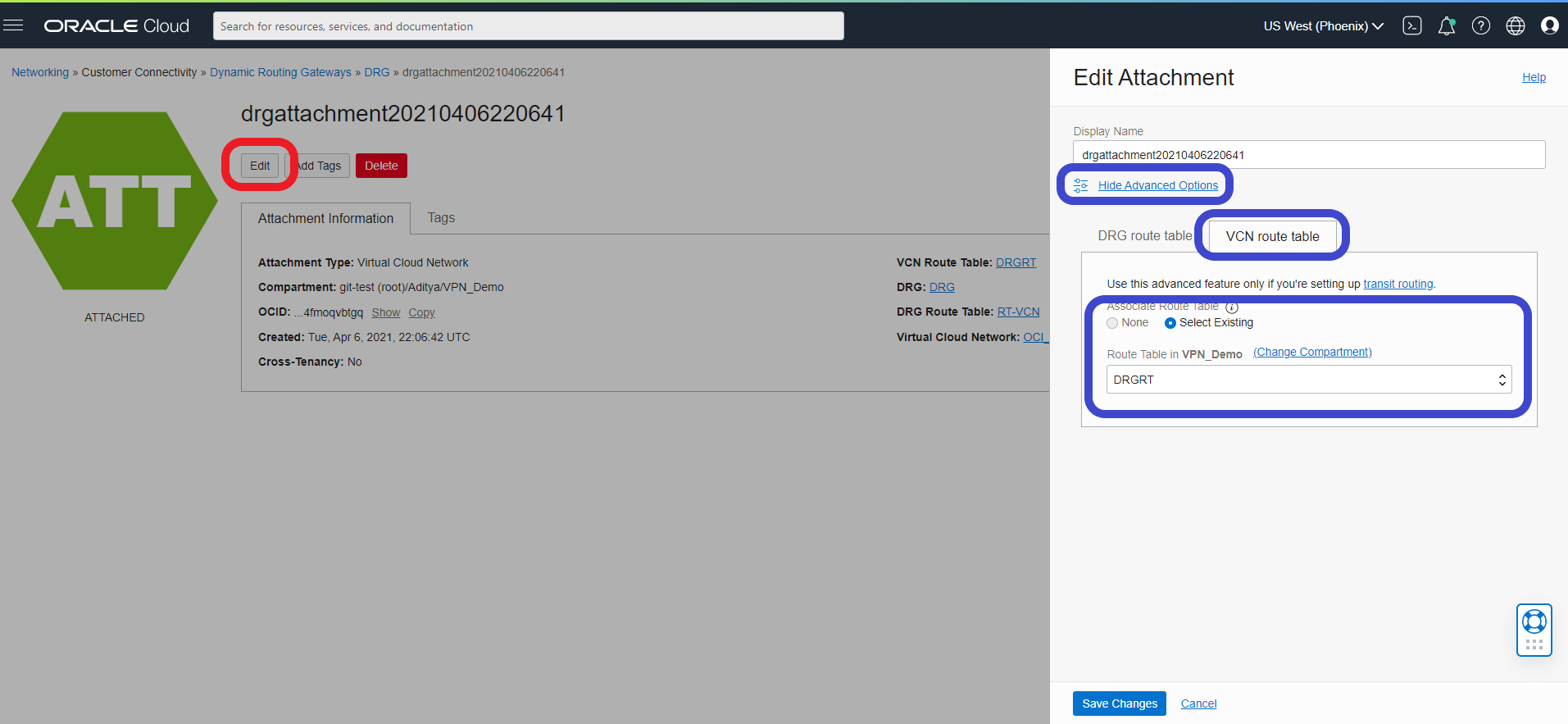 2.    Attach the newly created routing table to the VCN attachment by going to “VCN -> Dynamic Routing Gateways Attachment” and click on the attachment name: