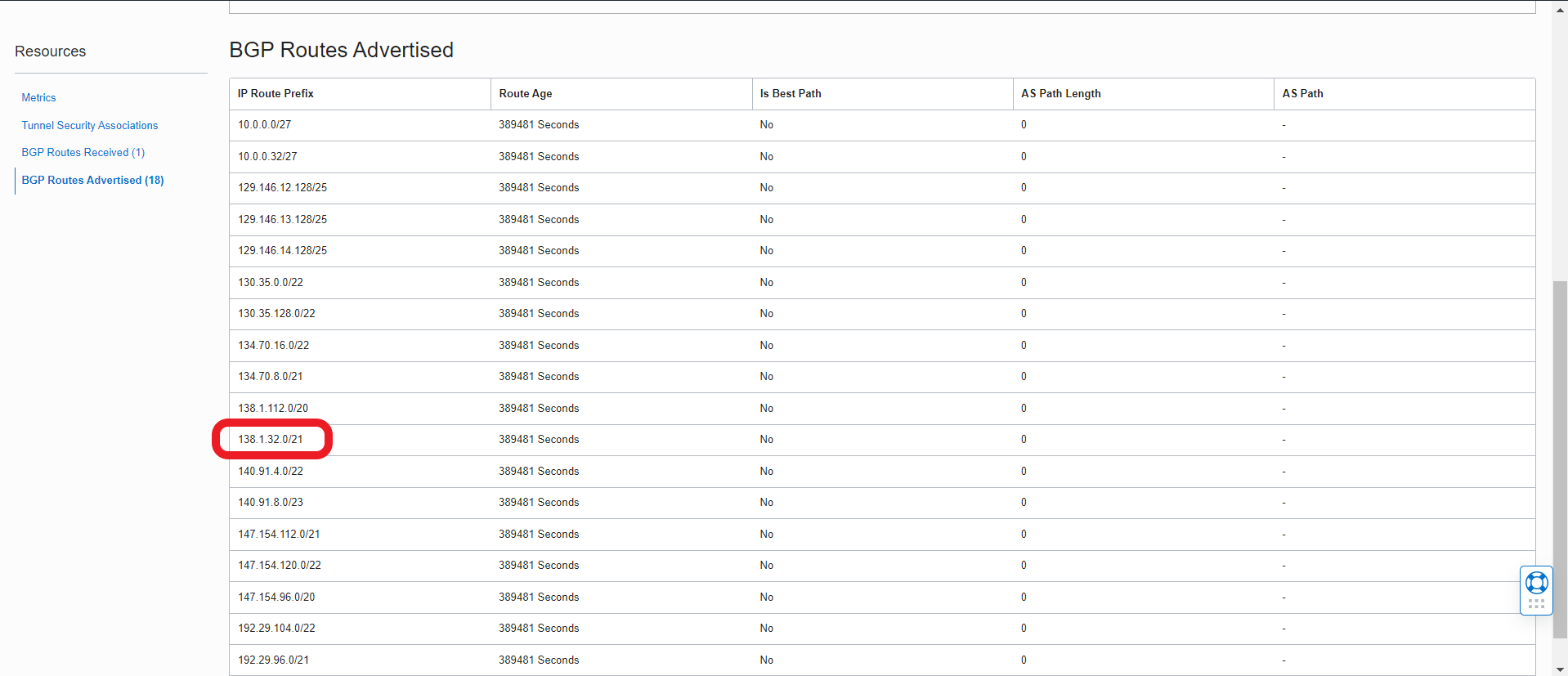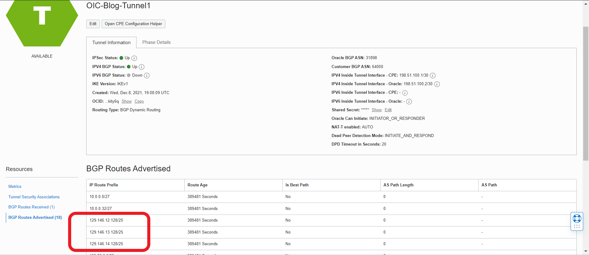 One of those subnets advertised via BGP will also have the OIC instance IP address, which in our case is part of the “138.1.32.0/21” subnet: