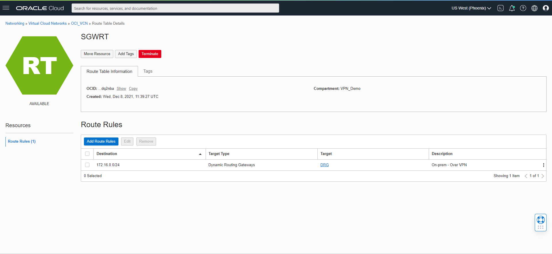4.    Now we need to create a new VCN routing table with the routing rule for the On-Premises CIDR block going via DRG: