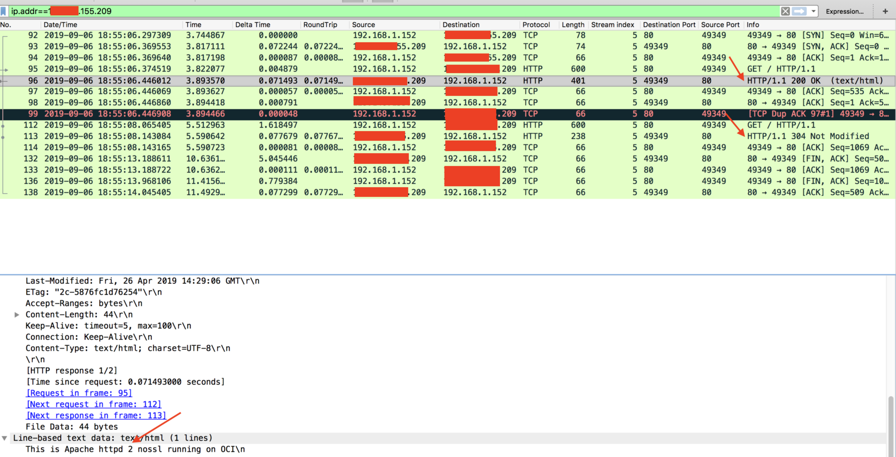 We can observe from the above trace that after TCP handshake (#65-67), the browser sent 3 requests to the Load Balancer (#68, 88, 98) and all 3 requests were sent within that connection. The corresponding responses came from Apache#1 (#70, 92, 99) as highlighted in the above trace: #70 was a HTTP 200 OK response with the content “This is Apache httpd#1 …” while the next two responses were HTTP 304 Not Modified. After the third request, the connection was closed (initiated by the server).