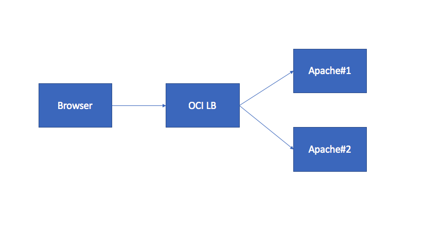 To keep things simple, the Apache servers use HTTP over port 80. Accessing the default page on Apache#1 returns “This is Apache httpd1 nossl running on OCI”. Similarly, Apache#2 returns “This is Apache httpd2 nossl running on OCI”. Also, the load balancing policy is round-robin with equal weight.