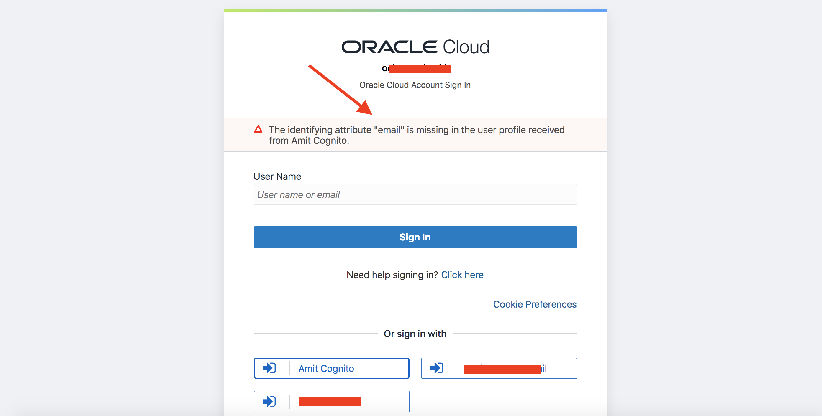 Cognito returns “preferred_username” as part of the response. Note “email” is not returned in the response. When IDCS does not find “email” in the response, it flags an error as in Fig 1.