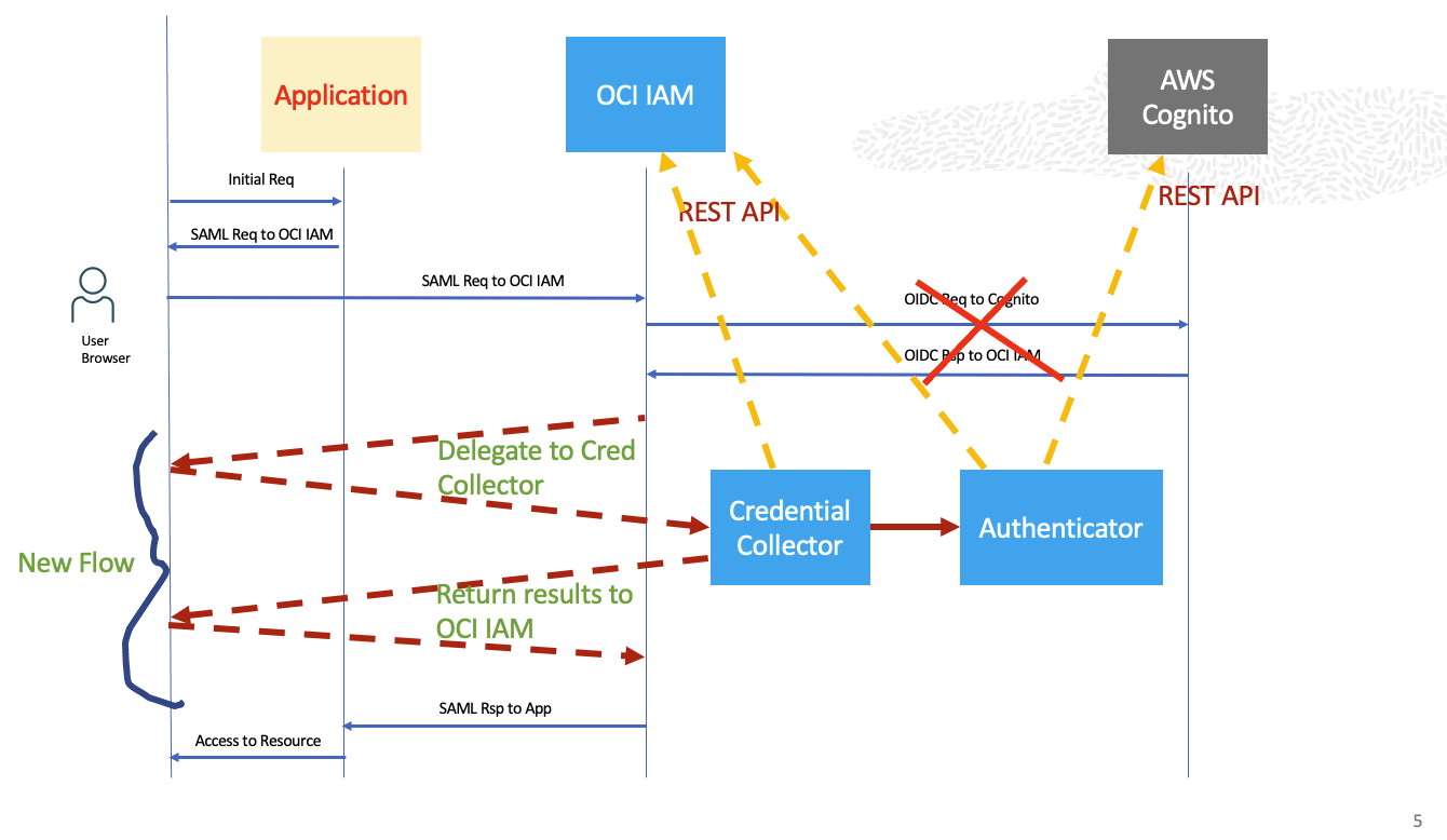 The following diagram illustrates this concept. The entire authentication process, especially the interaction between OCI IAM and Cognito no longer occurs as a browser flow. Instead, it has been replaced by the combo of two components – Credential Collector and the Authenticator. They use a bunch of REST API calls before returning the authentication results to the OCI IAM.