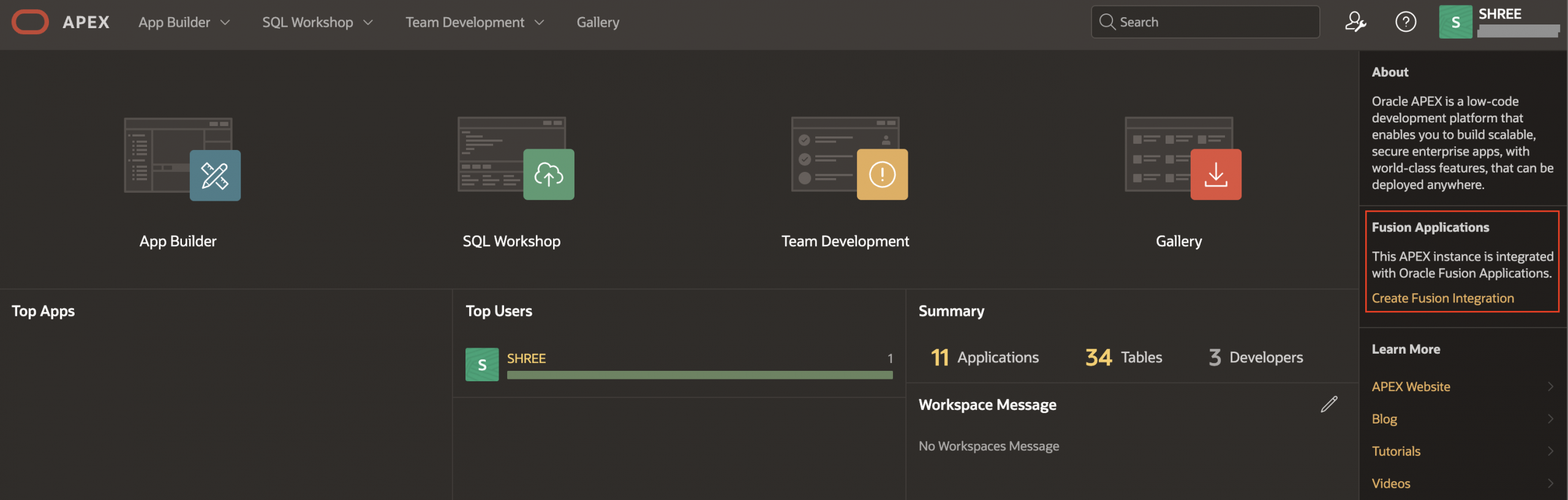 Notice that “This APEX instance is integrated with Oracle Fusion Applications” appears on the right side of Workspace homepage in APEX.