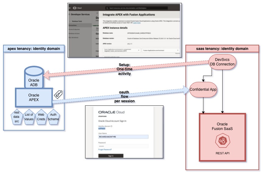 1. Cross tenancy – APEX and Fusion Application belong to different tenancies, potentially across 2 regions.