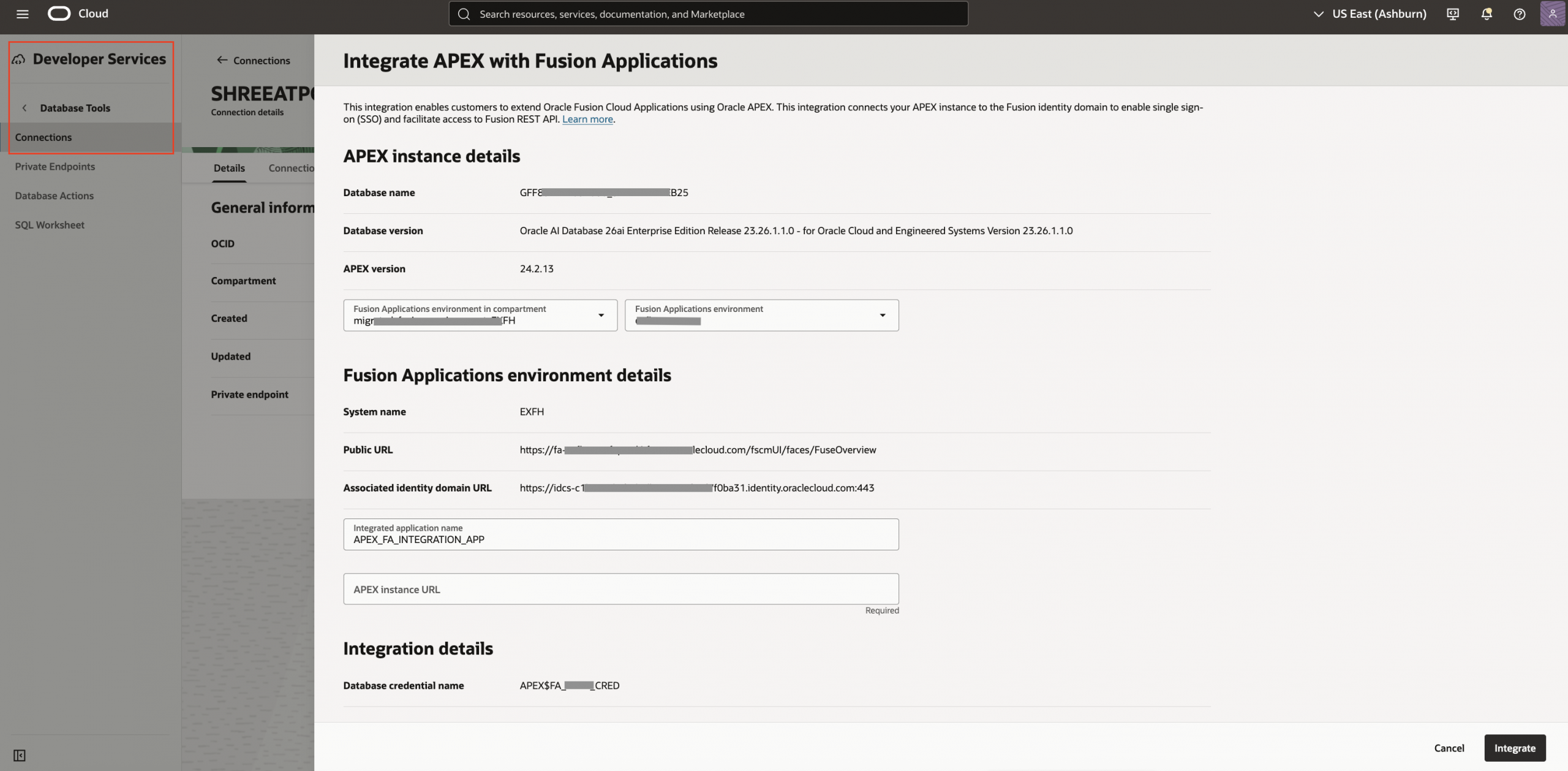 • On the database connection, choose ‘Integrate APEX with Fusion Applications’ from Actions menu
