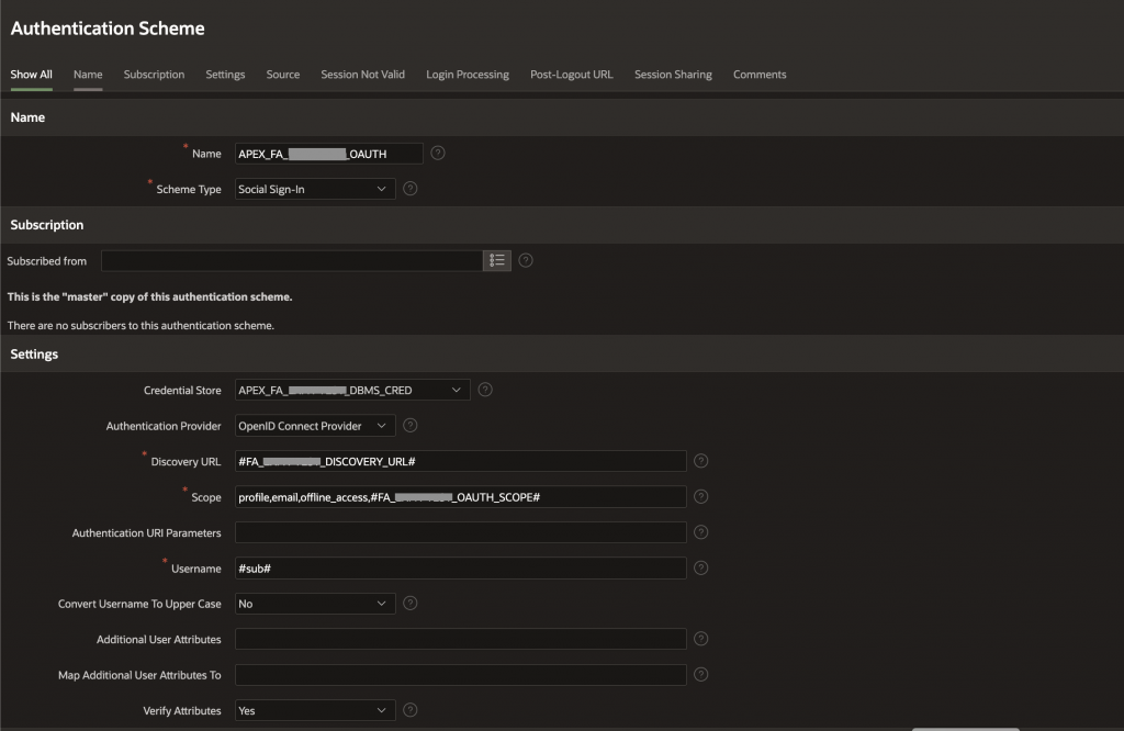 Navigate to the newly created application and within Shared Components, verify the Authentication scheme created to retrieve access token from Fusion Cloud application.
