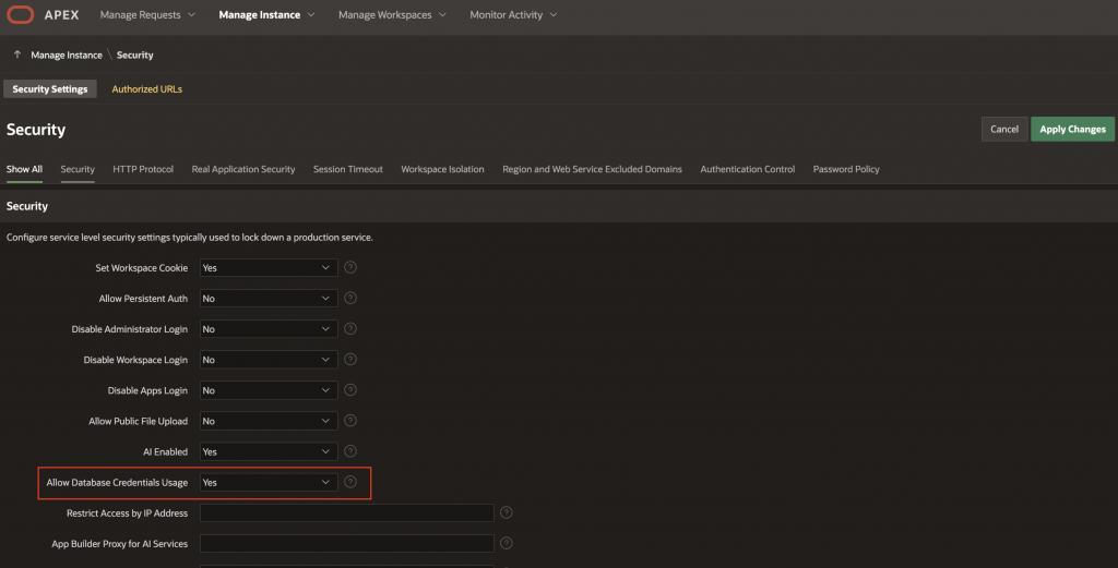 Ensure that ‘Allow Database Credentials Usage’ is enabled on APEX instance security settings. This can be enabled by logging into APEX Administration services and navigating to ‘Manage Instance > Instance Settings > Security’, as shown below