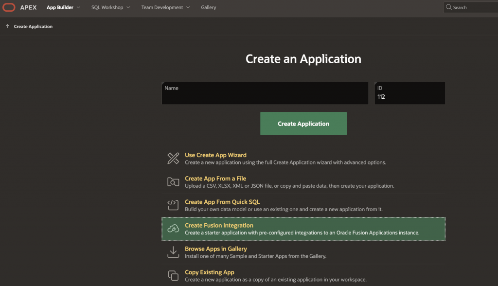 From the APEX Workspace click on AppBuilder -> Create and choose ‘Create Fusion Integration’