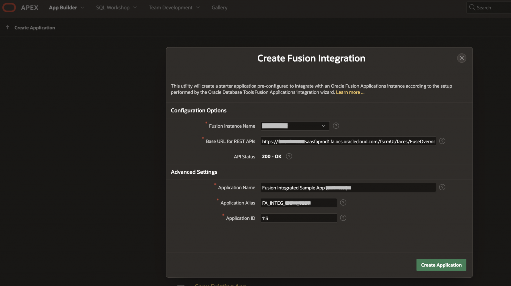 In the Options screen, select the Fusion instance from the dropdown. At this point APEX connects to the Fusion instance and the remaining fields auto-populate with defaults and can be changed if necessary. Select ‘Create Application’ to complete the creation of Fusion Integrated APEX application and associated objects like Authentication scheme.