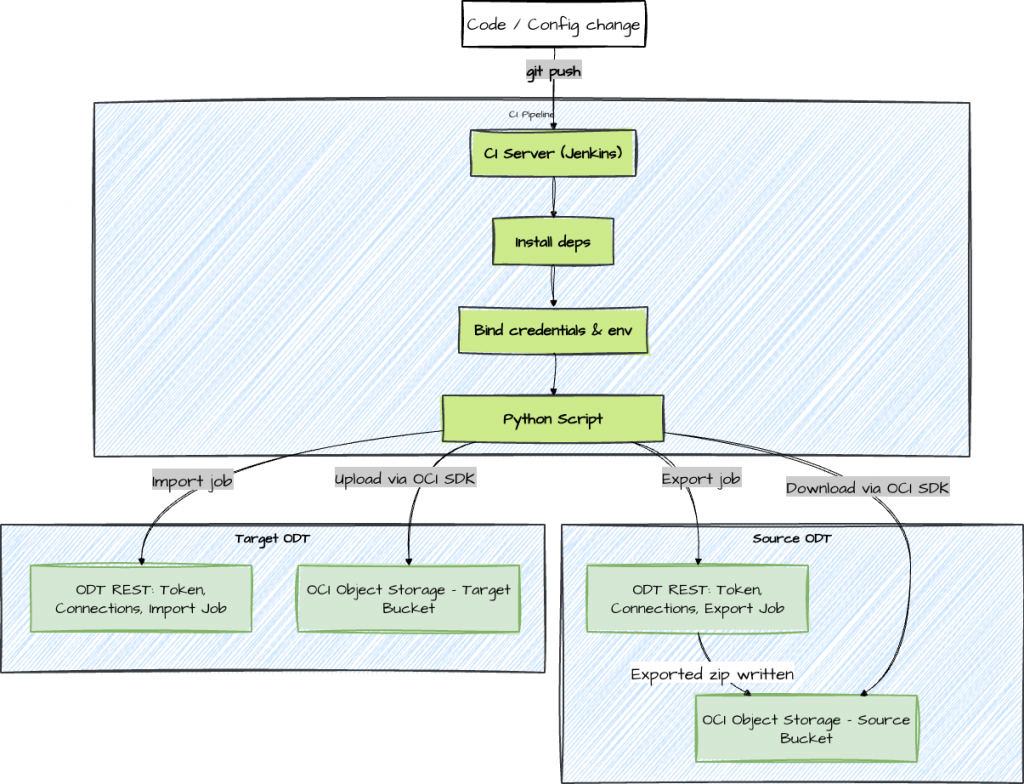 The Python helper keeps all ODT/OCI details out of the pipeline. It authenticates with ODT, discovers the correct Object Storage connection, starts export/import jobs, and waits for completion: