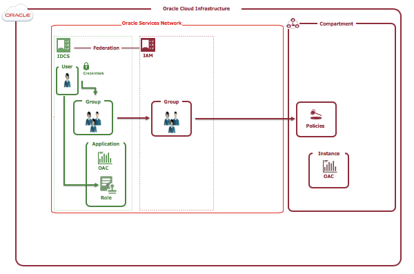 The provisioning process below creates an OAC instance in the OCI compartment. It also creates an IDCS application with the standard OAC IDCS application roles. The provisioning user is granted the ServiceAdministrator application role. After the provisioning the OCI topology looks like this: