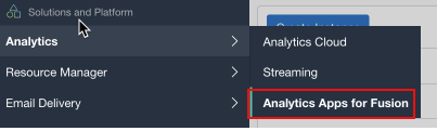 Open the navigation menu in the upper left , scroll down and hover over Analytics and click Analytics Apps for Fusion.